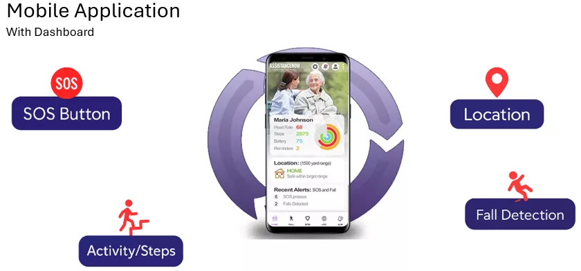 Monitor falls, steps, activity and location – all while being in a safe environment. Alerts are emitted to a Professional Care Manager or family members, should a loved one fall or call for help.