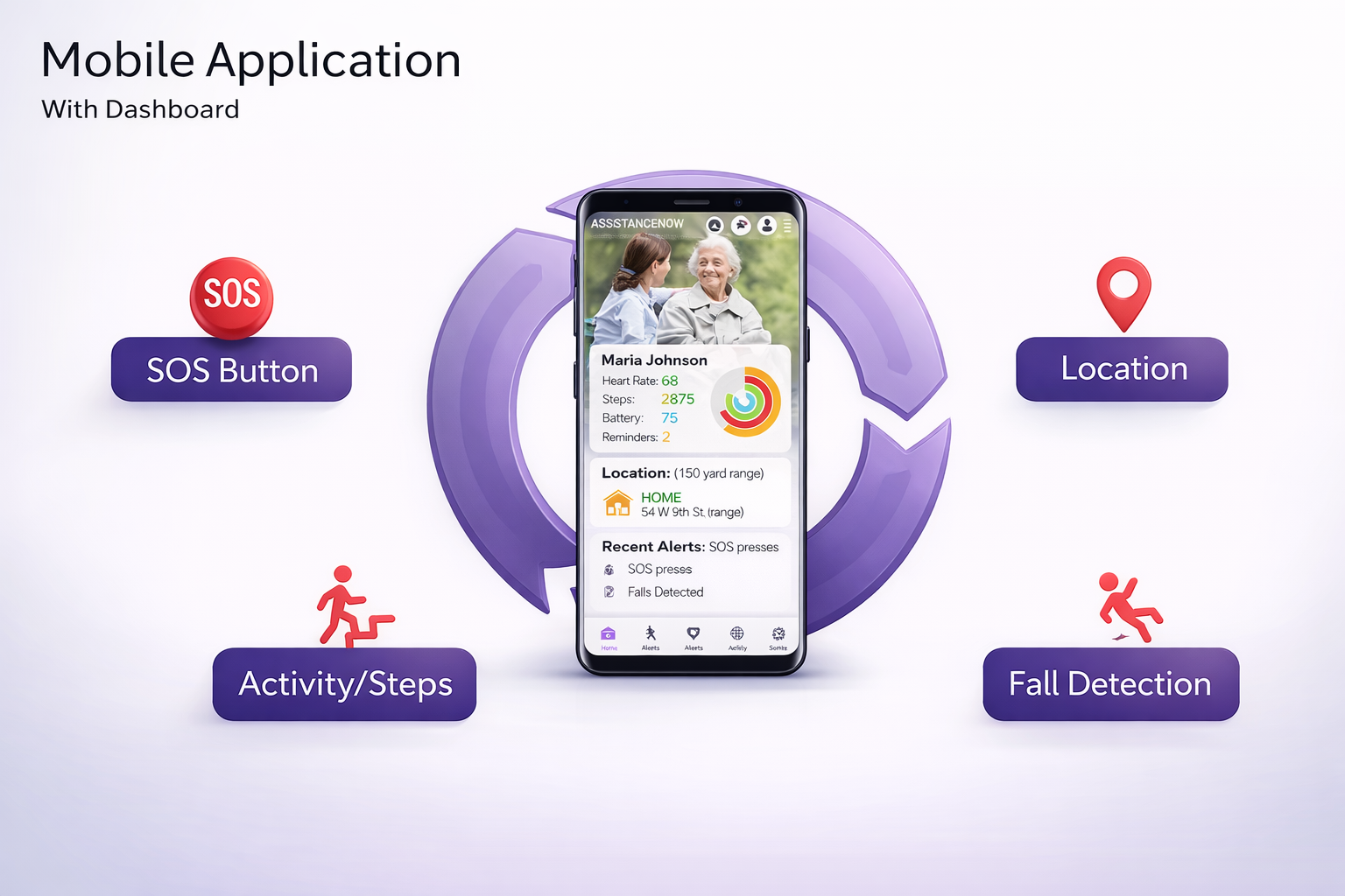 Monitor falls!!, steps, activity and location – all while being in a safe environment. Alerts are emitted to a Professional Care Manager or family members, should a loved one fall or call for help.